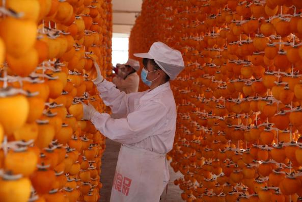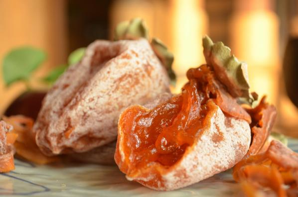 “想見(jiàn)冰盤(pán)中,石蜜與柿霜。”資深吃客蘇軾給予高度評(píng)價(jià)的“柿霜”便是柿餅。陜西富平有兩千多年的柿子種植史,被稱為“柿子之鄉(xiāng)”,位于黃土高原和關(guān)中平原過(guò)渡帶,富平冬季干燥寒冷,是制作柿餅得天獨(dú)厚的天氣條件。把霜降后采下來(lái)的尖柿經(jīng)削皮、晾曬、捏心等16道手工工序,析出雪白的糖霜,綿糯香甜的富平柿餅就制成了。