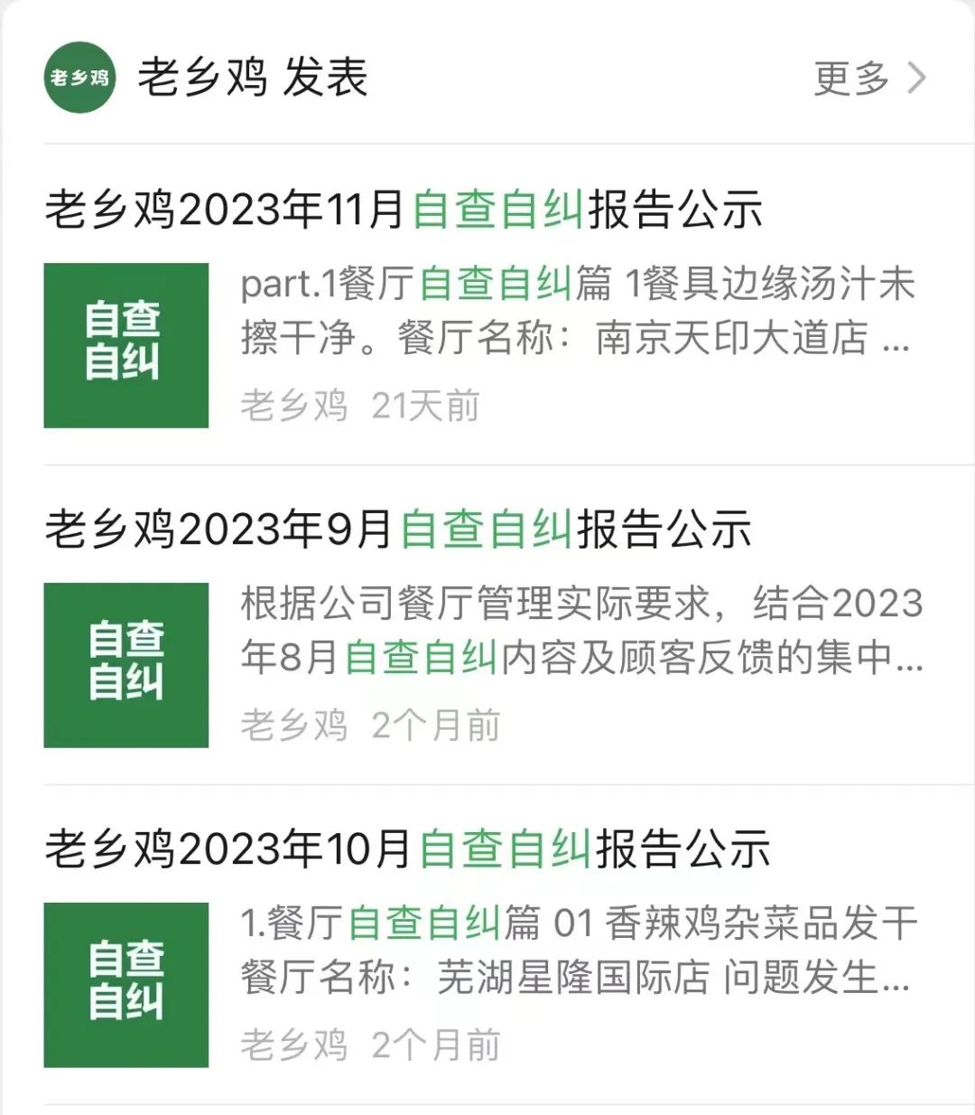 老鄉(xiāng)雞每月自查自糾報告 圖源:老鄉(xiāng)雞公眾號