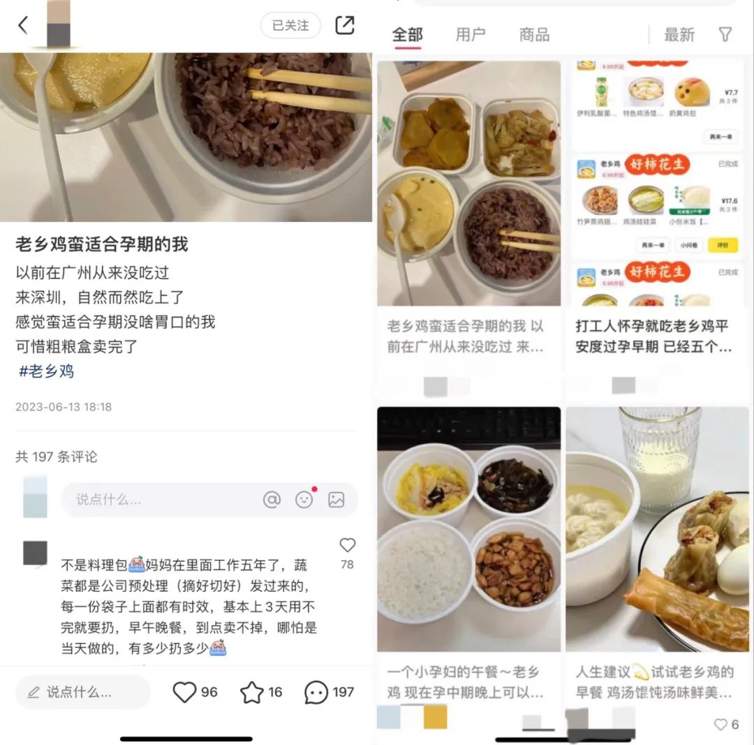 從社媒評論來看,老鄉(xiāng)雞成為不少網(wǎng)友懷孕、生病時的首選放心外賣。筆記中不乏:“打工人懷孕就吃老鄉(xiāng)雞,平安度過孕早期”、“病號餐就點(diǎn)老鄉(xiāng)雞”等標(biāo)題。
