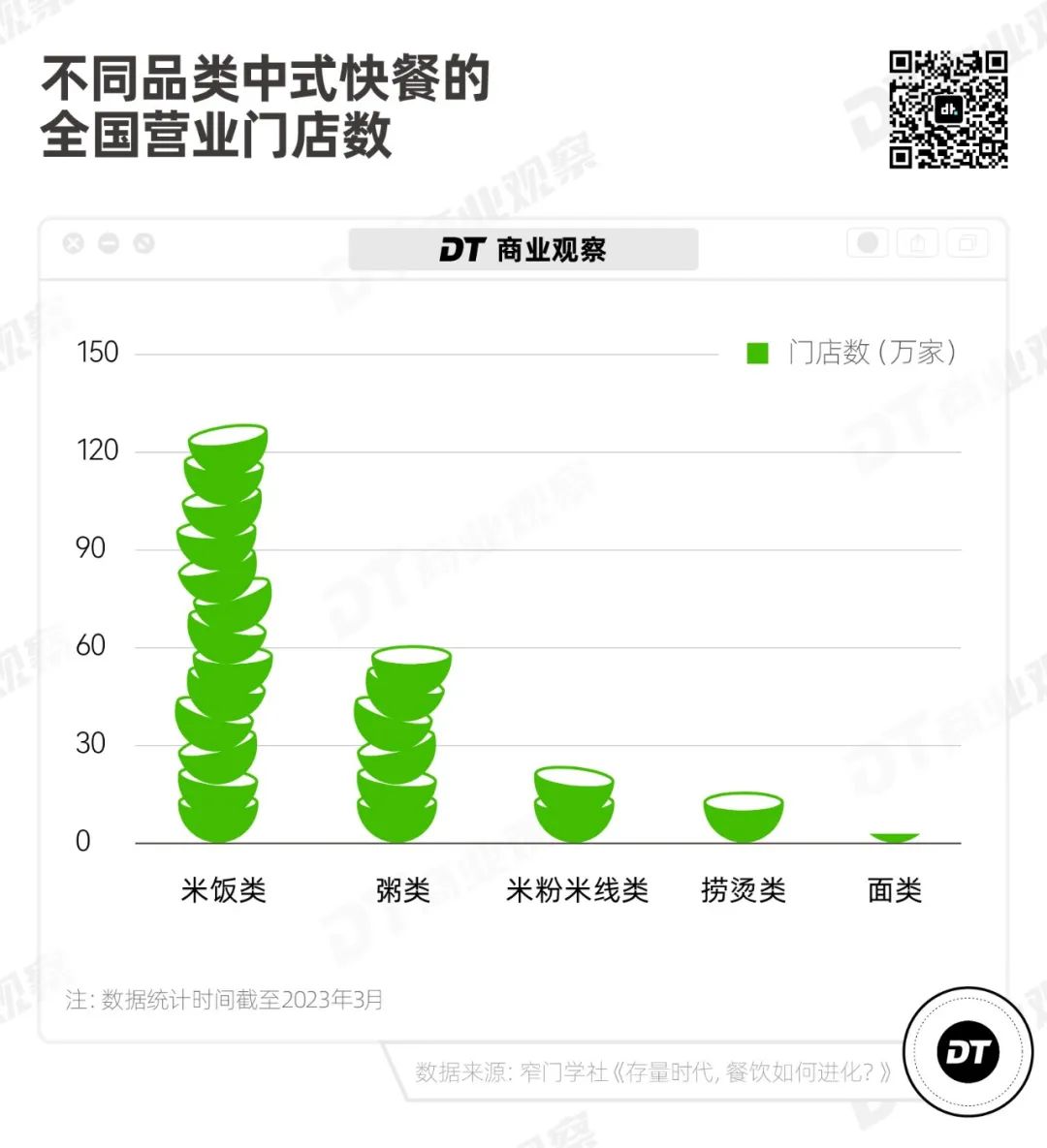 頭豹研究院數(shù)據(jù)顯示,截至2023年,中式快餐行業(yè)在整體快餐行業(yè)中的占比接近70%。DT商業(yè)觀察《快餐小調(diào)研》結(jié)論同樣顯示:在選擇快餐時,75%的消費(fèi)者會選擇以粥飯粉面為主的中式快餐。
