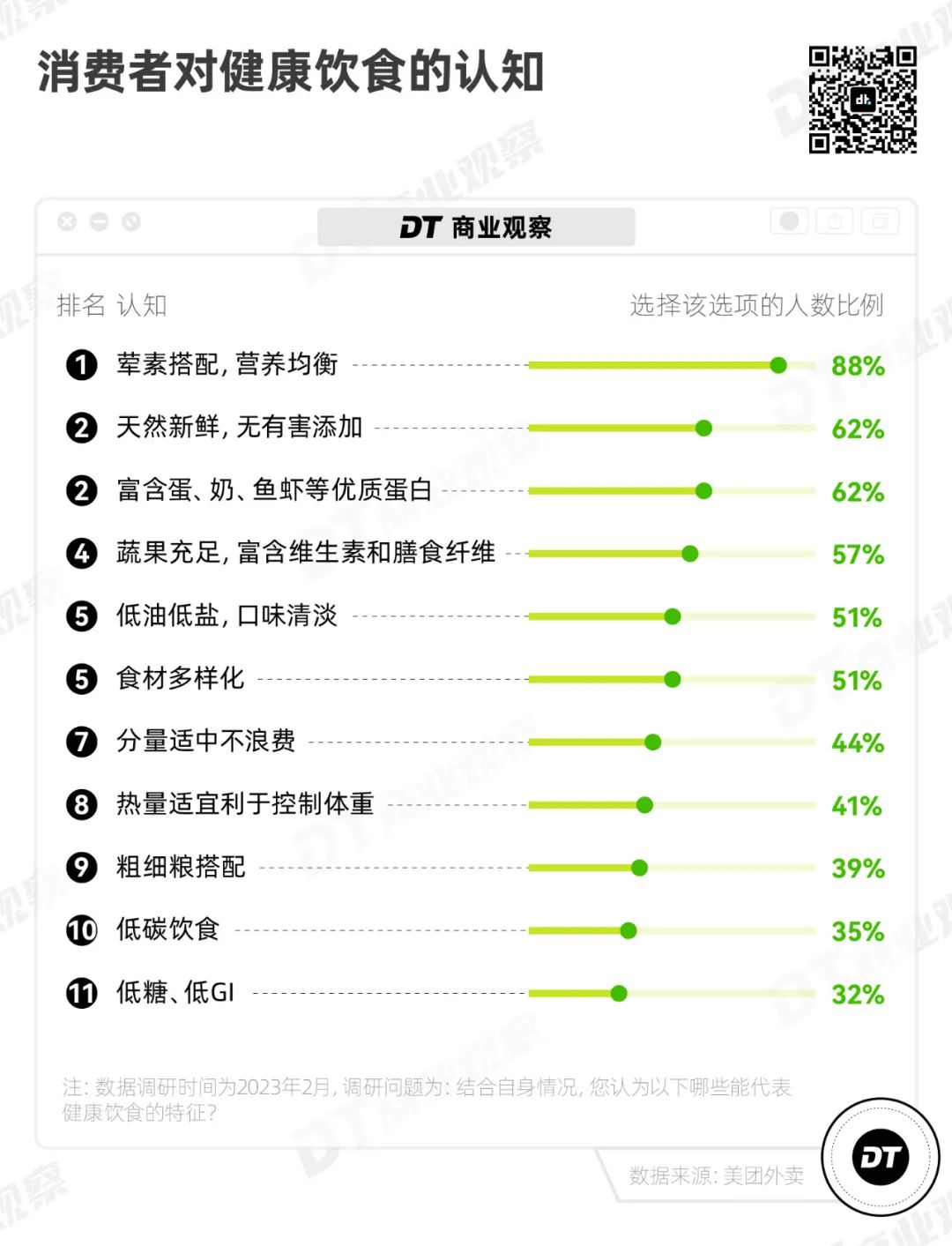 美團(tuán)《2023外賣服務(wù)健康消費(fèi)機(jī)會點(diǎn)洞察》報告顯示,消費(fèi)者對健康飲食認(rèn)知的前三位分別是:“葷素搭配,營養(yǎng)均衡”;“天然新鮮,無有害添加”和“富含蛋、奶、魚蝦等優(yōu)質(zhì)蛋白”!盁崃窟m宜利于控制體重”的排名反而沒那么靠前。