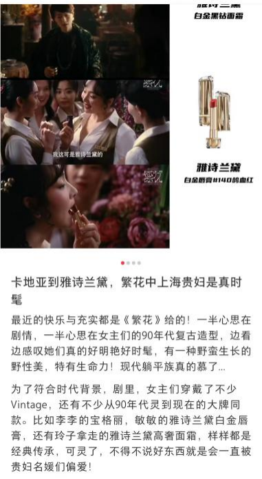 比如雅詩蘭黛在《繁花》中的每一個亮相,從其布景、打光,到場景、臺詞等設(shè)計,都兼具與品牌調(diào)性適配的審美趣味。