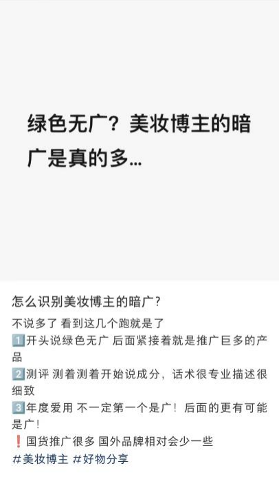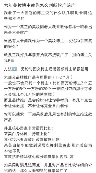 一方面,遵循著用戶“對口”原則,許多品牌會選擇跟美妝博主合作,但相較于明晃晃的廣告,“暗廣”似乎成為了消費(fèi)者更加“忌諱”的行為,如何揪出美妝博主的“暗廣”也成了許多消費(fèi)者熱議的話題。