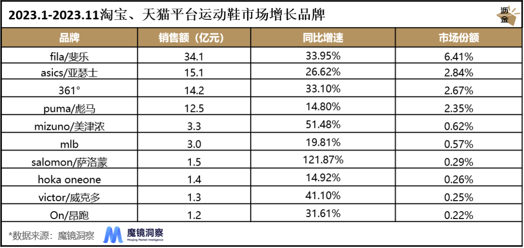 23年1-11月淘寶、天貓平臺(tái)運(yùn)動(dòng)鞋市場(chǎng)增長(zhǎng)品牌