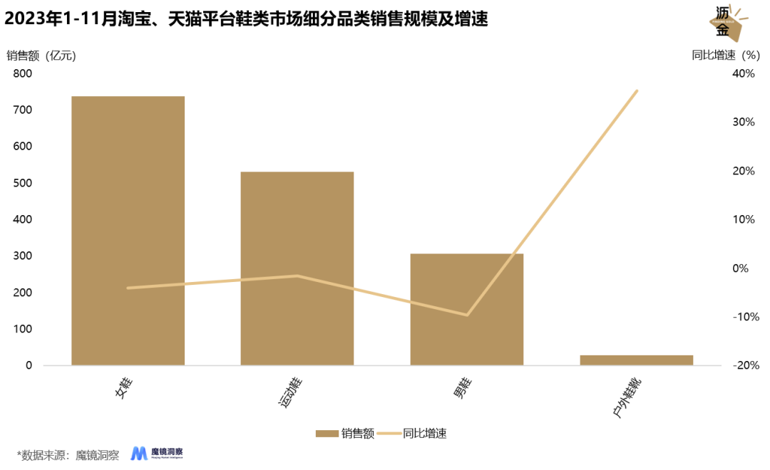 2023年1-11月淘寶、天貓平臺(tái)戶外服鞋市場(chǎng)增長(zhǎng)近50%,運(yùn)動(dòng)鞋市場(chǎng)卻增長(zhǎng)疲軟。
