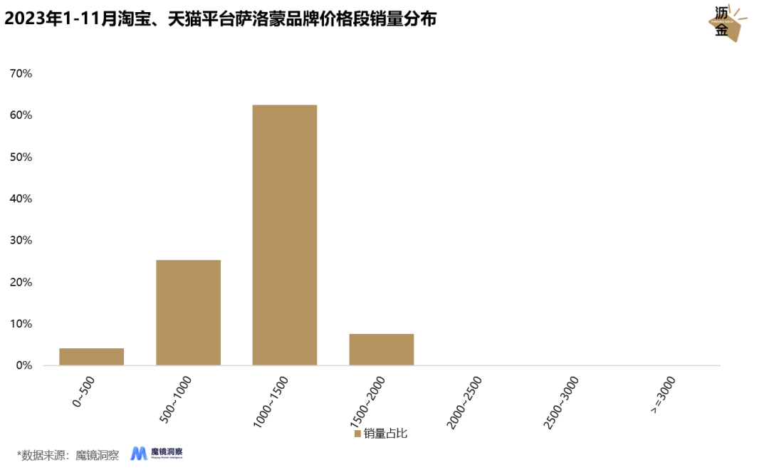 23年1-11月淘寶、天貓平臺(tái)薩洛蒙品牌價(jià)格段銷量分布
