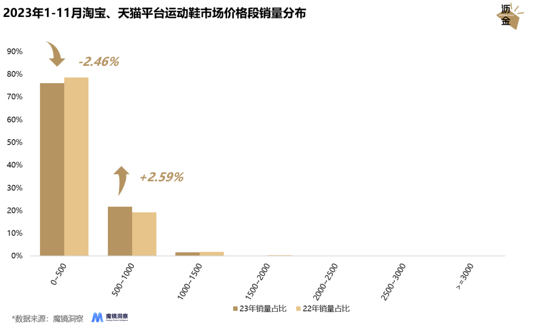 千元以下是運(yùn)動(dòng)鞋市場(chǎng)的主流價(jià)格段,其中0-500元銷量占比高達(dá)76%。
