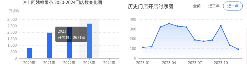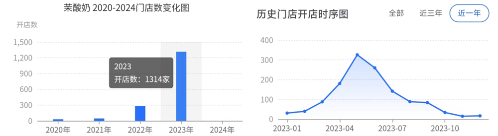 截至2024年1月4日,「茉酸奶」共有1609家門店,2023年新開門店數(shù)量為1314家,開店數(shù)是2022年的將近5倍。
