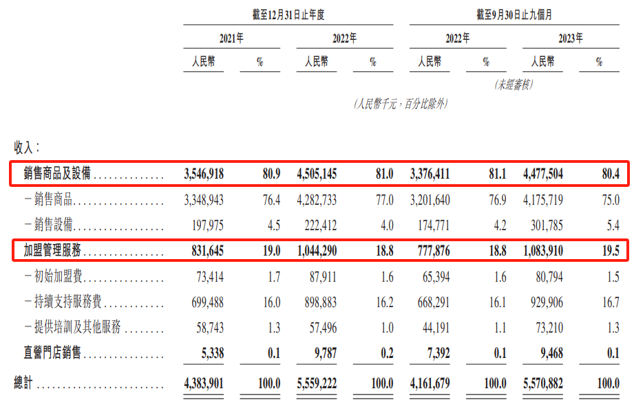 跟蜜雪冰城相似,古茗也主要依靠加盟商賺錢,招股書顯示截至2023年底,古茗的9001家門店中只有6家是直營店,23年Q1-Q3,面向加盟商銷售的商品及設(shè)備、加盟管理服務(wù)費(fèi)貢獻(xiàn)了99.9%的營收。