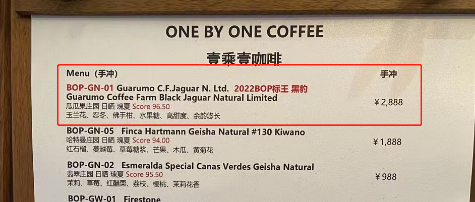 “標(biāo)王咖啡”定調(diào)性,帶來話題。比如,壹乘壹門店定價2888元/杯的手沖,用的是2022年BOP的標(biāo)王“黑豹”,PUMPLI咖啡店定價4988元/杯咖啡,用的是2023年巴拿馬最佳咖啡豆競賽中的標(biāo)王“卡門莊園水洗瑰夏”。
