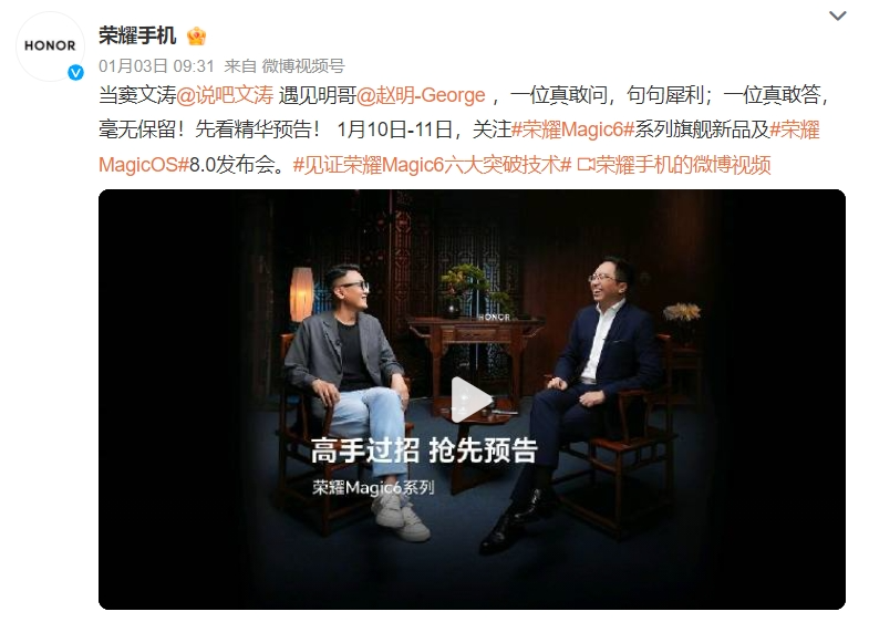 之后,從1月8日起,榮耀的官方賬號在社交媒體平臺上便開始陸續(xù)發(fā)布有關(guān)Magic6系列的宣傳內(nèi)容,對發(fā)布會進行預(yù)熱。