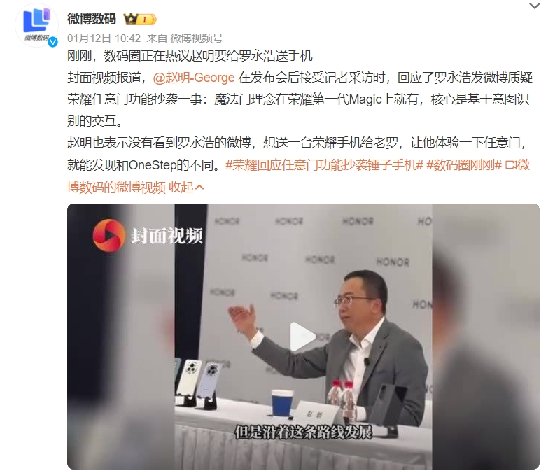 就在榮耀MagicOS 8.0發(fā)布會重點演示了“任意門”功能的第二天,曾經(jīng)創(chuàng)辦錘子手機的羅永浩轉(zhuǎn)發(fā)趙明介紹任意門的微博,吐槽到:“這就是赤裸裸照抄錘子手機的One Step啊,趙老師是不是被做產(chǎn)品的孩子給騙了?”