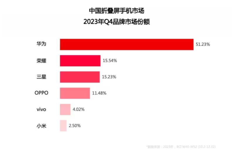 但僅憑“性價比”這一點,在高端市場并不算絕對優(yōu)勢,根據(jù)市調(diào)機構(gòu)BCI公布的最新數(shù)據(jù)顯示,在剛剛過去的2023年第四季度,國內(nèi)折疊屏手機市場,華為一家就拿到了52.37%的市場份額,超過其他各品牌的總和。