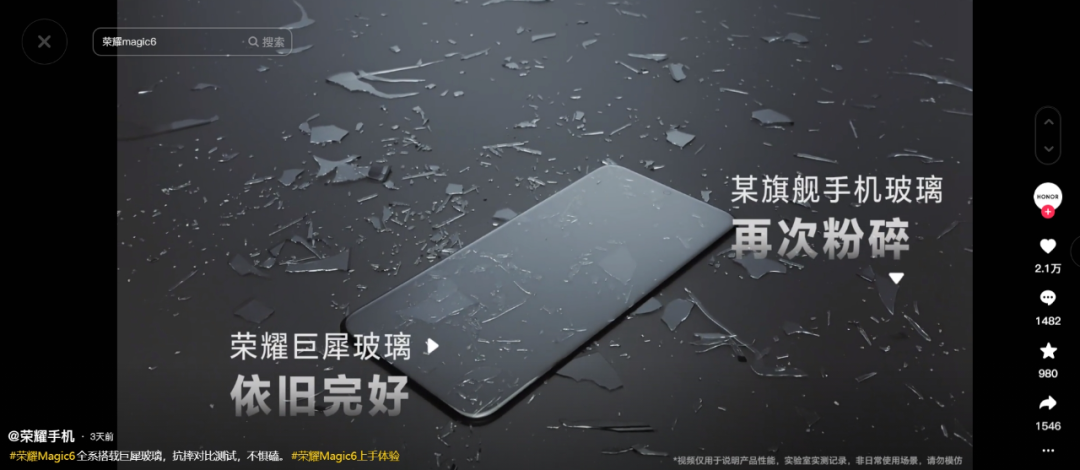 其中,為展現(xiàn)“巨犀玻璃”的堅硬抗摔性能,在一段抗摔對比測試視頻中,將友商旗艦手機玻璃擊成碎渣;該視頻還在1月9日沖進了抖音熱點榜的TOP20,獲得了4000多萬人次的觀看。