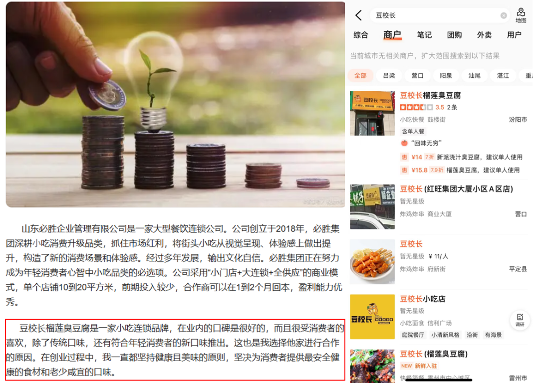 “知了快訊”在3月發(fā)布“豆校長榮獲A+輪融資5000萬,服務再度升級”的文章,開頭的話術和前面提到的愚公炸串、龍門炸串類似。文章后半部分還出現(xiàn)了以“加盟商”口吻的文字內(nèi)容。