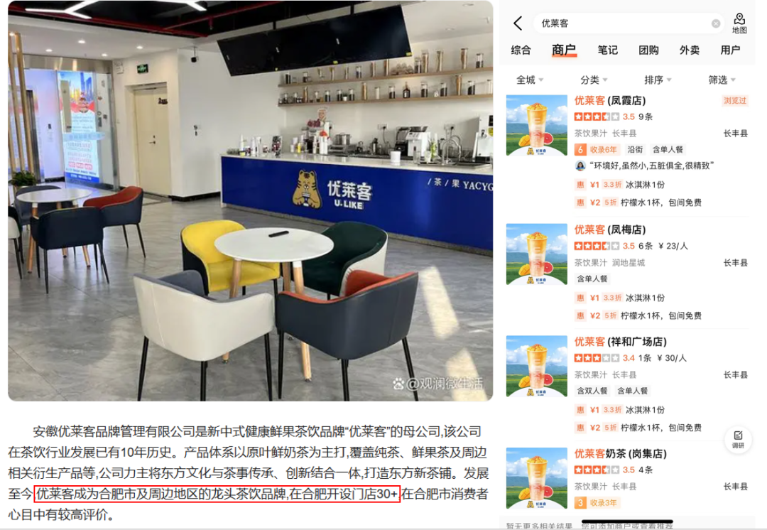 “觀瀾微生活”在2月發(fā)布了鮮果茶品牌“優(yōu)萊客”的融資信息,稱“優(yōu)萊客成為合肥市及周邊地區(qū)的龍頭茶飲品牌,在合肥開設門店30+,在合肥市消費者心目中有較高評價。”但大眾點評顯示,優(yōu)萊客在合肥目前僅在營4家門店,均位于合肥市長豐縣,實際狀況與報道不相符。