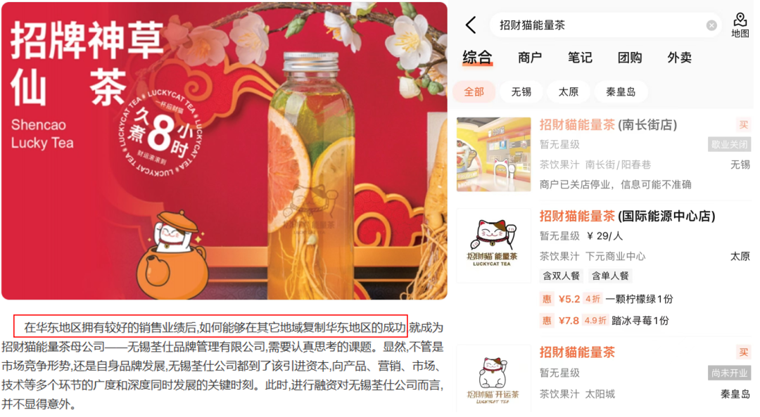 企媒創(chuàng)氪同樣也在3月發(fā)布招財貓能量茶母公司“無錫荃仕品牌管理有限公司”,獲得A輪5000萬融資的消息,文章中提到“在華東地區(qū)擁有較好的銷售業(yè)績”,但在大眾點評上,切換到無錫,可以發(fā)現(xiàn)無錫的門店已經(jīng)歇業(yè)關閉,在營門店只有太原一家,秦皇島門店尚未開業(yè)。實際狀況似乎與報道并不匹配。
