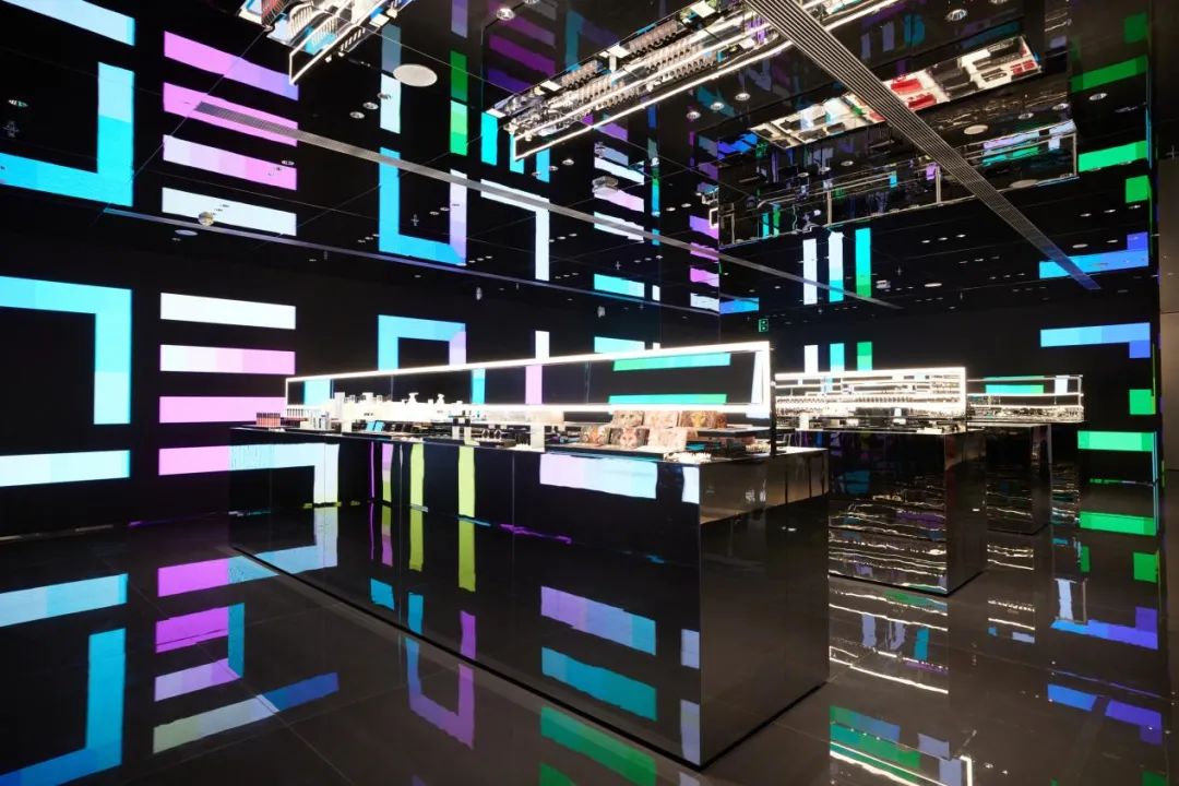 門店“通天達(dá)地”的LED屏幕代替了傳統(tǒng)墻面,從內(nèi)延伸到外,隨著超大幅超高清畫面的流動(dòng),整個(gè)墻面仿佛打開了一面通往“新次元”的大門,為整間店奠定了科技感、未來感、超現(xiàn)實(shí)的基調(diào)。