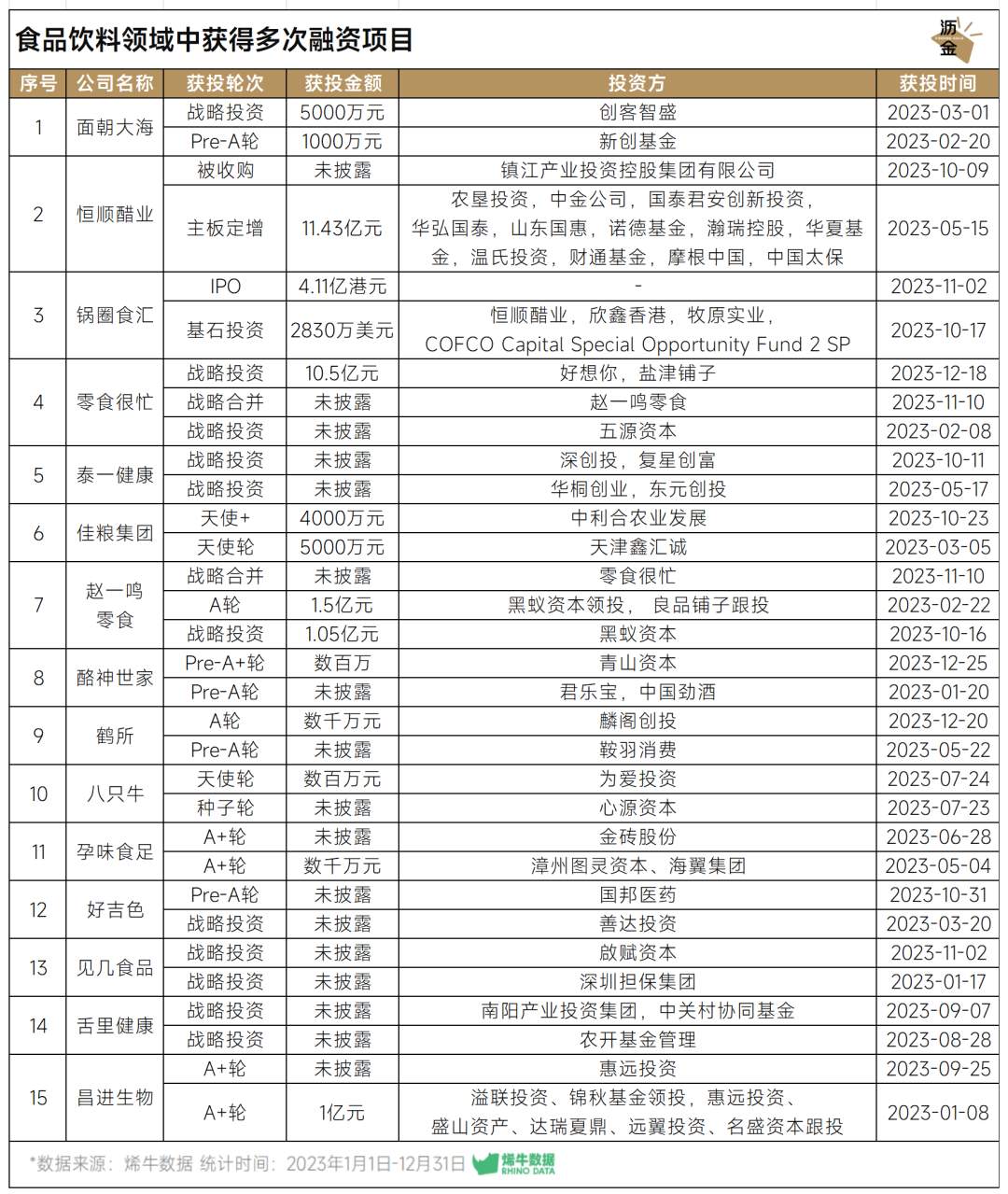 2023上半年,食品的巨額融資主要集中在調(diào)味品和食用油等供應(yīng)鏈企業(yè),其中,中糧福臨門(mén)拿到了全年最高的一筆投資;