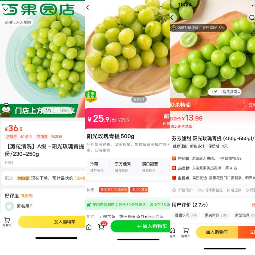 對(duì)此,伯虎財(cái)經(jīng)分別在百果園(美團(tuán)外賣(mài)店)、小象超市、美團(tuán)優(yōu)選這三個(gè)渠道搜索“陽(yáng)光玫瑰青提”,得到的價(jià)格分別是36.5元(230-250g)、25.9元(500g)、13.99元(450-550g)。