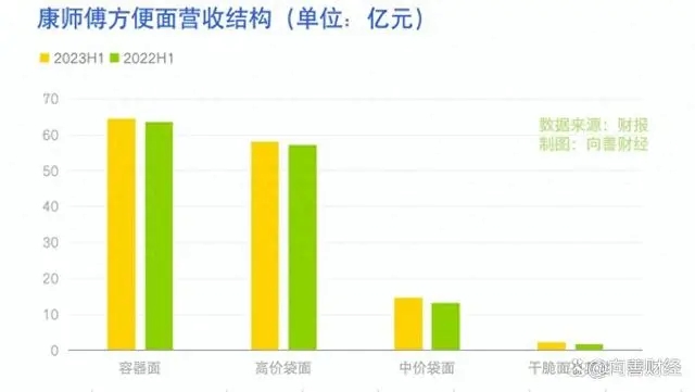 2023年半年報顯示,康師傅方便面業(yè)務營收139.5億,同比增長2.97%,營收占比從35%下滑到34%。具體來看,容器面收入64.51億元同比增長1.49%,高價袋面同比增長1.56營收為58.04億元。