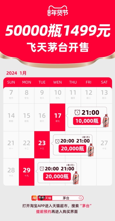 1月17日,天貓年貨節(jié)正式開啟,飛天茅臺迎來年度放量,1月17日-29日年貨節(jié)期間,50000瓶1499元飛天茅臺將在天貓超市正式開售。