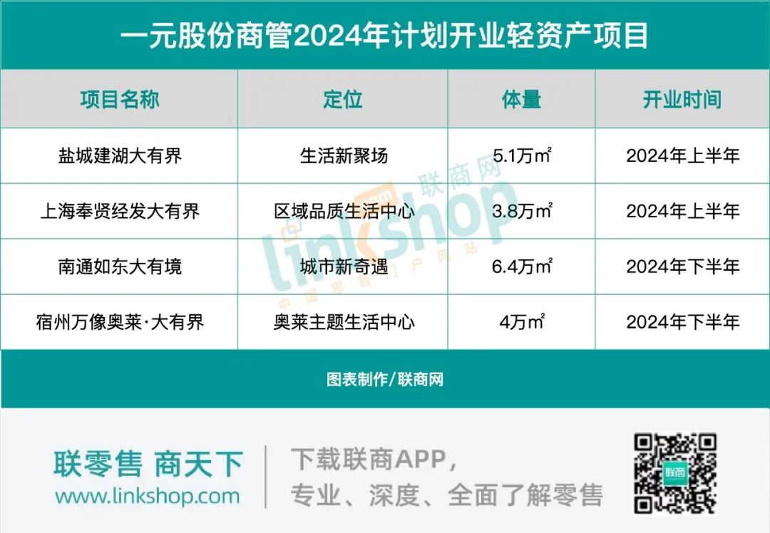 據(jù)悉,一元股份商管板塊新一年計(jì)劃開業(yè)4座輕資產(chǎn)項(xiàng)目,將于2024年華麗綻放: