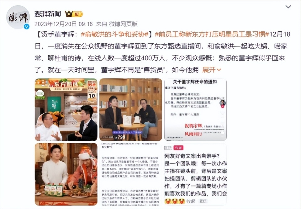 另外,由于此前的“小作文風(fēng)波”發(fā)酵度過高、持續(xù)時間太長,產(chǎn)生了一定的“長尾效應(yīng)”;包括董宇輝的“丈母娘們”在內(nèi),很多網(wǎng)友對俞敏洪和東方甄選產(chǎn)生了質(zhì)疑,從而影響了信任感。
