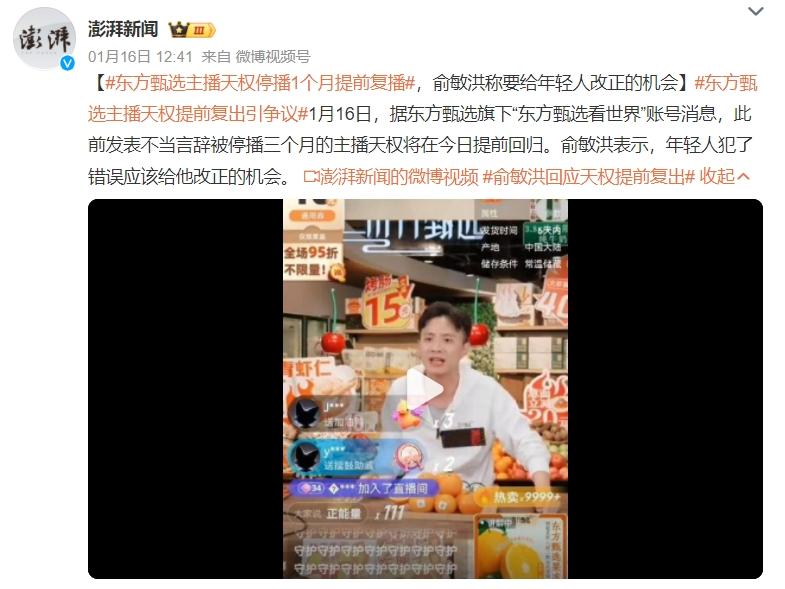 1月16日,因不當(dāng)言辭被懲罰停播3個月的東方甄選天權(quán)提前復(fù)播,出現(xiàn)在當(dāng)天上午的“東方甄選看世界”太舞滑雪場直播中,并與俞敏洪及主播林林一起直播帶貨。