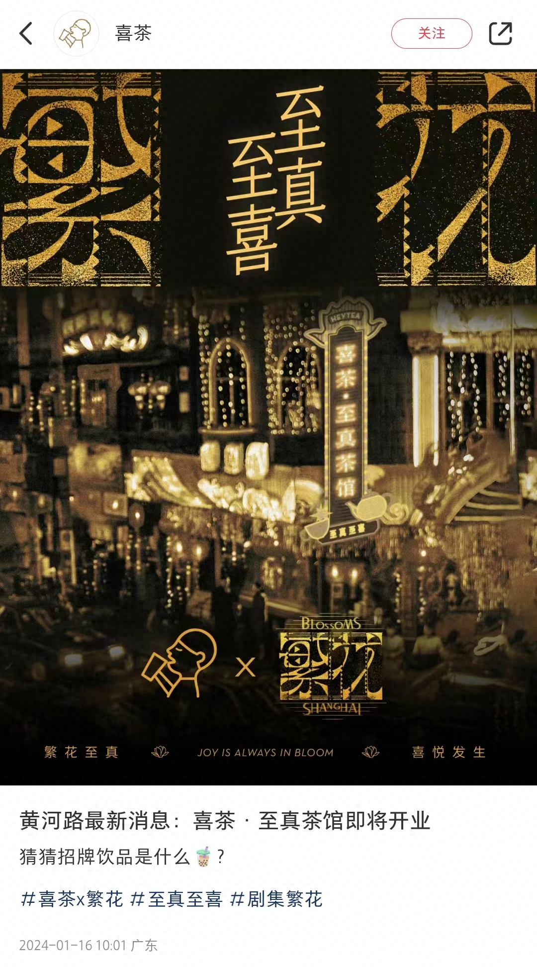 先是喜茶,準備和大熱電視劇《繁花》聯(lián)名,開一家至真茶館。消息一出,網(wǎng)友紛紛猜測聯(lián)名會出啥新品,是寶總泡飯米麻薯,還是排骨年糕混搭風(fēng)的奶茶?也有眼尖的網(wǎng)友發(fā)現(xiàn)海報中有一朵小小的白玉蘭,因此猜測新品應(yīng)該和白玉蘭有關(guān)。
