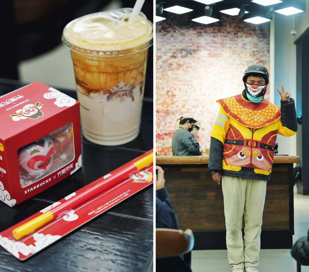為搭配這次聯(lián)名,星巴克還推出了“大鬧天宮金箍管”,自帶聲光電效果。專星送專屬騎手還變裝成“齊天大圣”。在北京、上海、廣州等地,你都可以遇見送咖啡的“猴哥”。