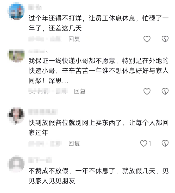 但是,也有另一部分網(wǎng)友持反對意見,他們認為快遞員也是人,應(yīng)該享有休息的權(quán)利,不贊成不放假。甚至有網(wǎng)友直言,“春節(jié)不打烊”的形式遠遠大于內(nèi)容,雖然口號響亮,但實際落實情況并不理想。