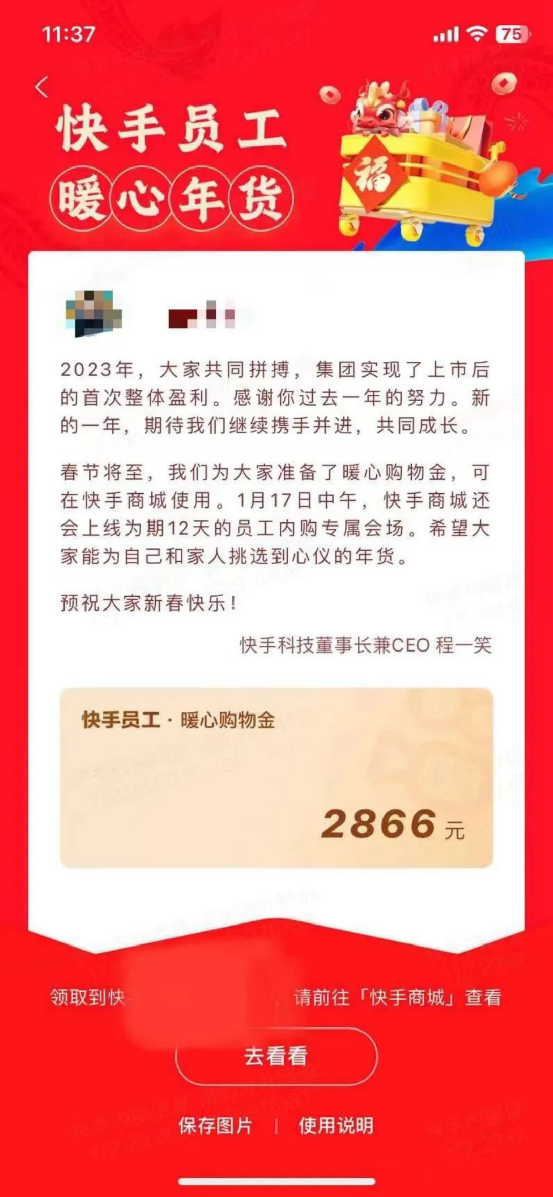 日前,快手CEO程一笑通過內(nèi)部信宣布快手實(shí)現(xiàn)上市后首次整體盈利,為感謝員工過去一年的努力付出,將向員工派發(fā)最高為2866元暖心購物金。據(jù)了解,工齡滿三年(含)以上員工可獲得2866元暖心購物金,其他員工也將獲得數(shù)額不等的暖心購物金。