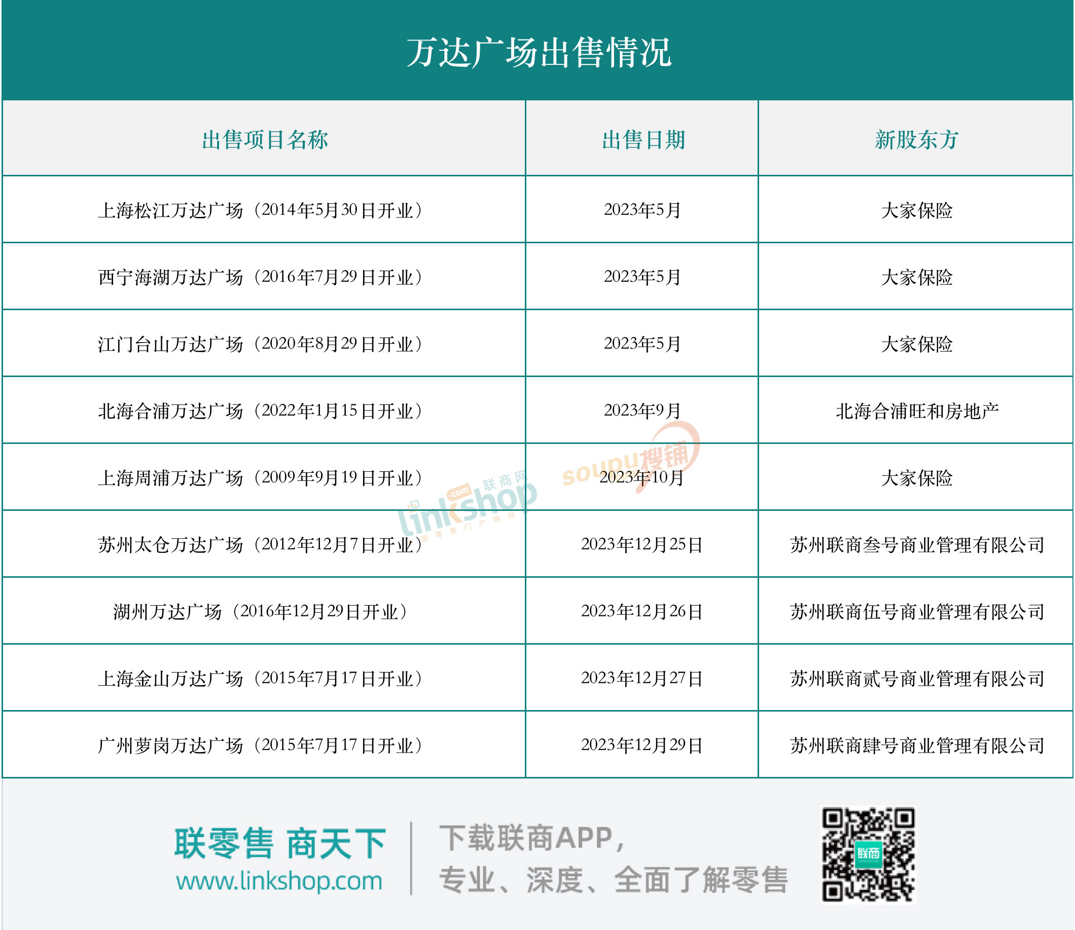 2023年5月底,萬達將上海松江萬達廣場、西寧海湖萬達廣場和江門臺山萬達三個購物中心出售予大家保險;10月份,又將上海周浦萬達廣場出售予大家保險。