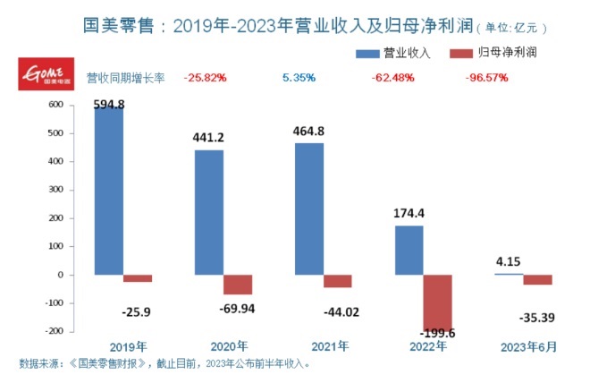 2023年上半年度財報顯示,國美零售2023年上半年的營業(yè)收入僅有4.15億元。門店數(shù)目從2843家減少至2398家,關(guān)閉445家,下降了15.65%。