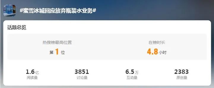近日,有消息稱,蜜雪冰城內(nèi)部數(shù)月前實施戰(zhàn)略調(diào)整,“已經(jīng)基本叫停了瓶裝業(yè)務(wù)”。與此同時,“蜜雪冰城回應(yīng)放棄瓶裝水業(yè)務(wù)”的話題沖上微博熱搜第一,閱讀量高達1.6億,互動量超6.5萬。