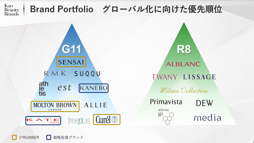 在最新調(diào)整后的的全球重點(diǎn)品牌金字塔中,G11包括:SENSAI、RMK、SUQQU、ATHLETIA、EST、KANEBO、MOLTON BROWN、ALLIE(從R8被替換為G11)、KATE、FREEPLUS和Curél。