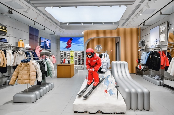 在商品陳列上,以戶外滑雪服飾和裝備為主,占據(jù)了門店的正中央位置。同時,在兩側(cè)的陳列架上,輔以兒童高爾夫、綜合運動以及運動生活系列商品。