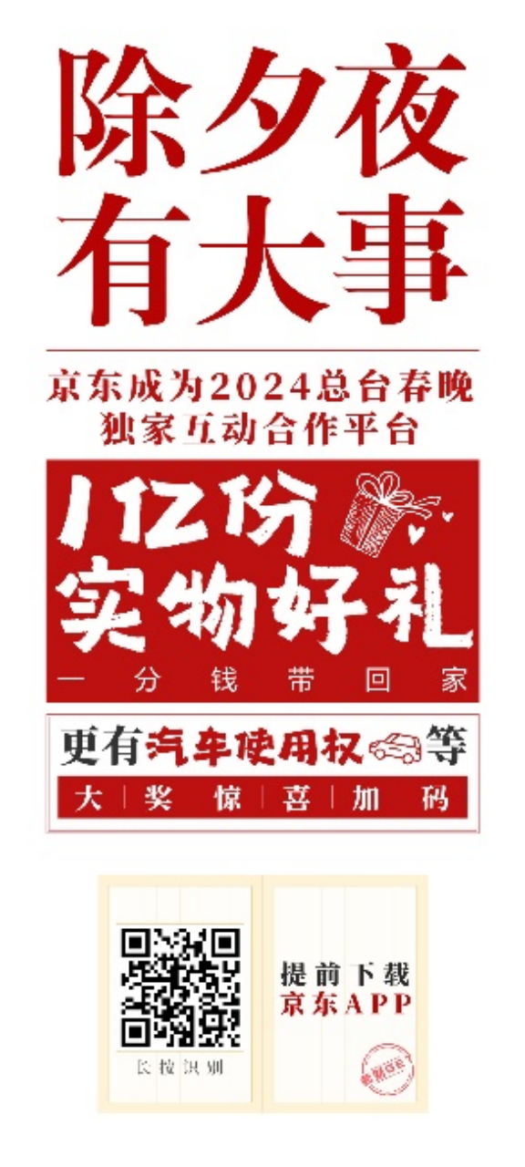 作為總臺春晚獨家互動合作平臺,京東在攜手中央廣播電視總臺為全球華人帶來“文化年夜飯”的同時,也將為海內外觀眾送上1億份實物好禮,更有汽車使用權等驚喜大獎數(shù)量再次加碼!與全球華人共同迎接甲辰龍年的到來。