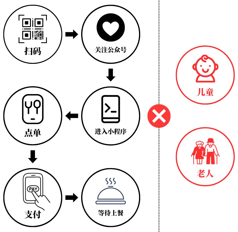 流程之復(fù)雜,過(guò)程之繁瑣,對(duì)于未成年人,以及不熟悉智能手機(jī)操作的老年人來(lái)說(shuō),掃碼點(diǎn)餐就是一道難以逾越的數(shù)字鴻溝。