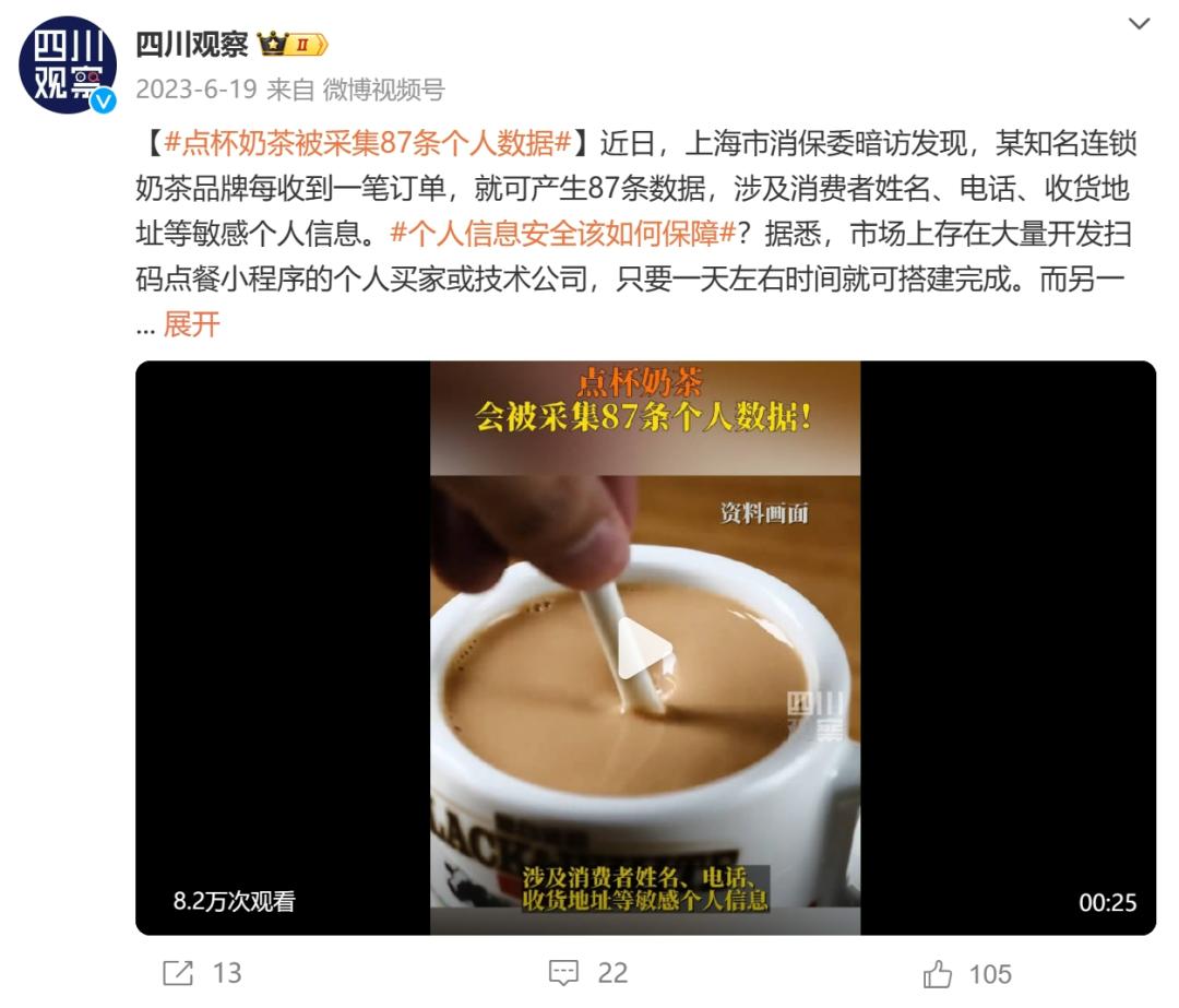 上海市網(wǎng)信辦在調(diào)查中發(fā)現(xiàn),某知名連鎖奶茶品牌每收到一筆訂單,就可產(chǎn)生87條數(shù)據(jù),截至2023年3月,其累計(jì)產(chǎn)生的數(shù)據(jù)超100億條,其中涉及消費(fèi)者姓名、電話、收貨地址經(jīng)度緯度等敏感個(gè)人信息的達(dá)6.7億條。