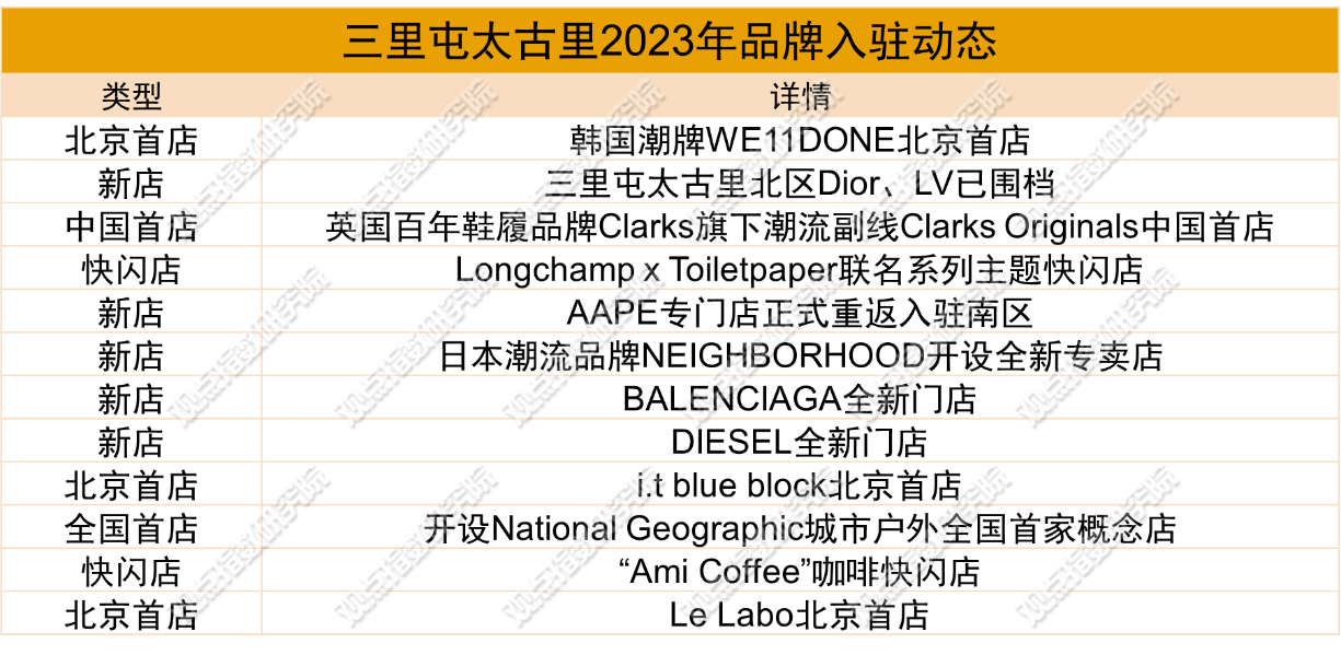 回顧2023年,觀點(diǎn)指數(shù)統(tǒng)計(jì)下的樣本項(xiàng)目引入超過200家店鋪,其中頭部企業(yè)的重點(diǎn)項(xiàng)目有更高的品牌吸引力,如三里屯太古里期內(nèi)就有不少首店及新店開業(yè)。