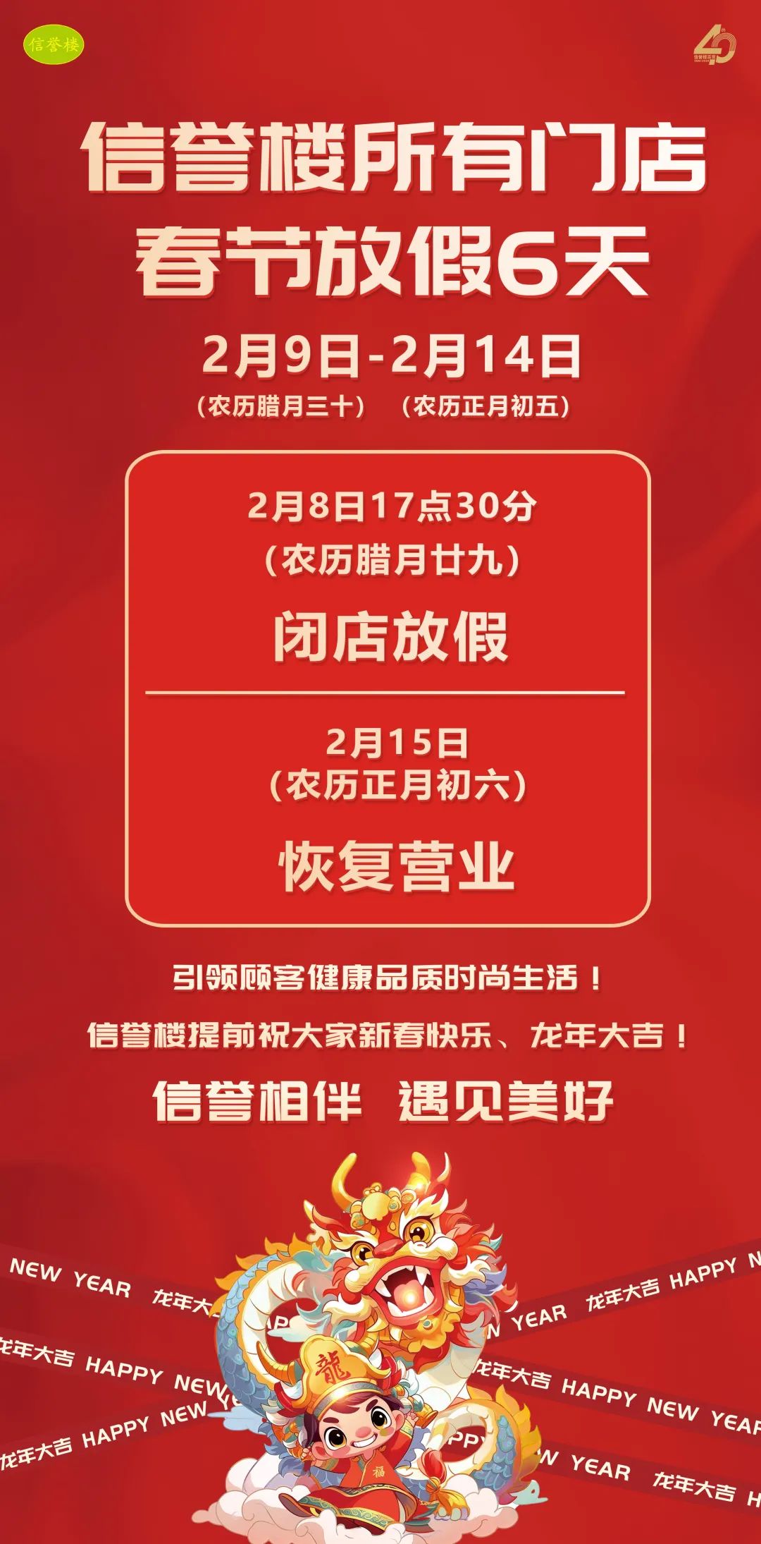 2024年信譽(yù)樓春節(jié)期間放假安排如下: