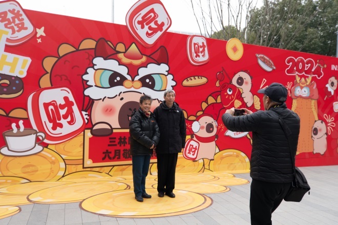 長(zhǎng)達(dá)15米的“卡皮巴拉”創(chuàng)意互動(dòng)圍擋同樣成為了一道亮麗的風(fēng)景線,吸引了眾多市民的目光。滿載金幣的聚寶盆、寓意財(cái)運(yùn)的麻將牌,開(kāi)啟一整年的好運(yùn)!翱ㄆぐ屠币泊魃狭诵履甓ㄖ频凝堫^帽,傳遞浦發(fā)三林印象匯對(duì)顧客的美好祝福。