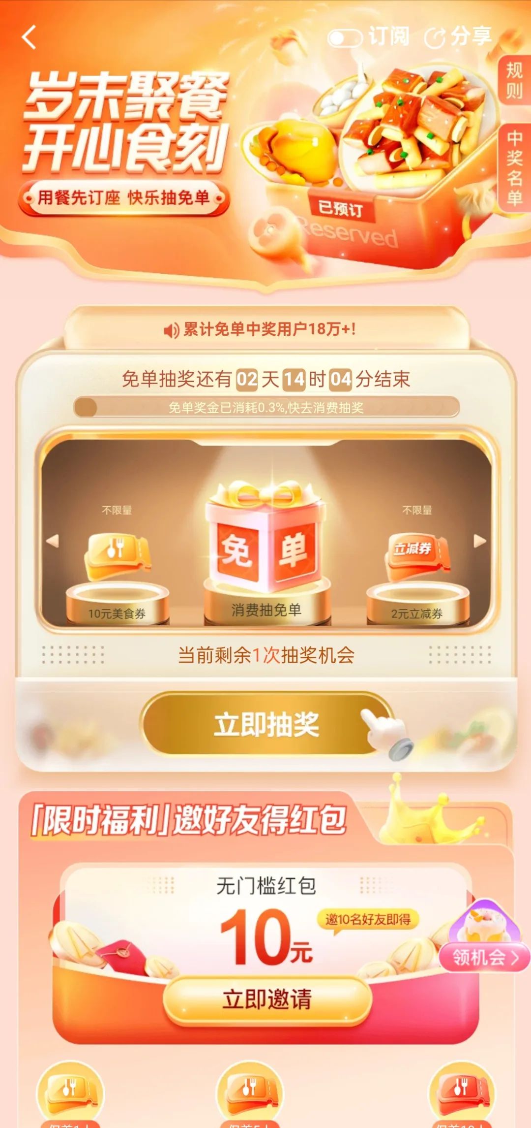 比如繼承了餓了么到店業(yè)務(wù)的高德,聚焦春節(jié)訂座需求,推出了免單抽獎活動。只要用戶進行團購券下單、訂餐廳、寫評價等操作,即可獲得抽獎機會,大獎是直接獲得已核銷訂單所對應(yīng)的實付金額,即所謂的“免單”;