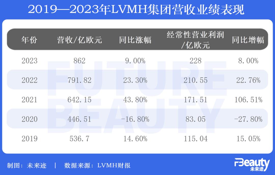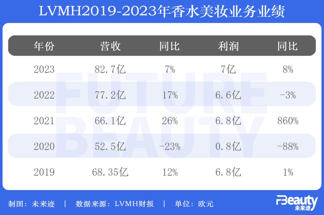 2023年LVMH的香水美妝業(yè)務(wù)還算穩(wěn)扎穩(wěn)打,營業(yè)收入及利潤分別增長7%、8%,盡管營收增幅相較前兩年有所下降,但這也是LVMH的香水美妝業(yè)務(wù)營收首次突破80億歐元,利潤額也首次突破7億歐元。