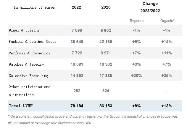 就不同部門業(yè)績情況來看,除葡萄酒等酒類業(yè)務(wù)以外,LVMH其他主要業(yè)務(wù)2023年的有機(jī)營收均強(qiáng)勁增長。該酒類業(yè)務(wù)全年收入同比下跌7%至66億歐元,有機(jī)收入下跌4%,營業(yè)利潤減少2%至21億歐元。