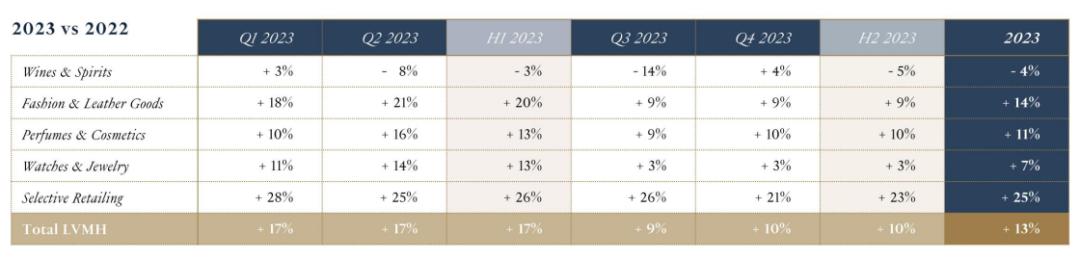 至此,2023年LVMH全年僅有三季度營收遜于預(yù)期,一季度和二季度的營收均增長17%,三季度9%的增速幾乎只有前兩個(gè)季度的一半。