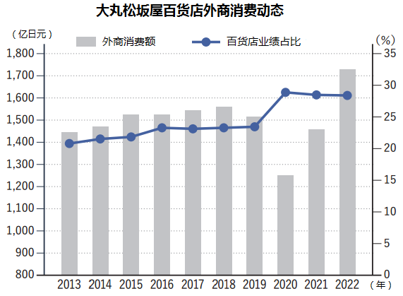 從銷售業(yè)績結(jié)構(gòu)看,2022年大丸松坂屋百貨店整體銷售額低于2019年,但奢侈品銷售額與2019年度相比增長52.8%。JFR集團(tuán)在戰(zhàn)略上集中投資于主力店的奢侈品經(jīng)營規(guī)模,擴(kuò)大面積、增加品牌,以2022年為例,奢侈品店鋪改造投資占公司總投資額的40%,實(shí)踐證明這種決策取得顯著成果。面對外商會員的銷售額約為1880億日元,同比增長16.7%,與2019年度相比增長了10.0%,超過了疫情前的水平。