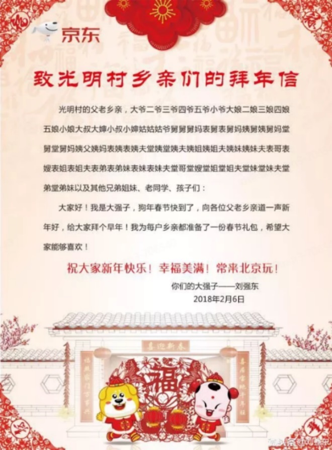 2018年春節(jié),劉強(qiáng)東也為當(dāng)時(shí)全村的800多戶人家送去春節(jié)大禮包,雞鴨魚(yú)肉,家電生活用品,樣樣齊全。此外,他還寫了一封《致光明村鄉(xiāng)親們的拜年信》,落款為“你們的大強(qiáng)子”,處處透露著對(duì)家鄉(xiāng)父老鄉(xiāng)親的思念。